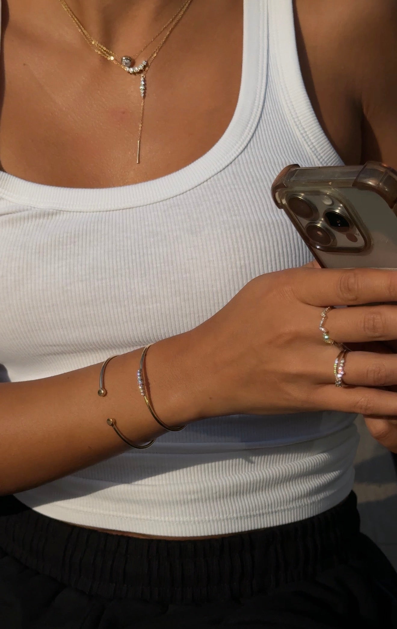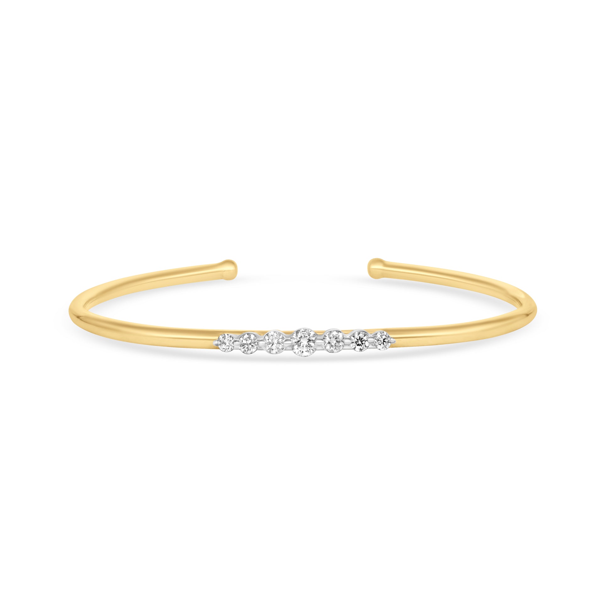 Embrace contemporary elegance with the Dégradé Cascade Bangle. This striking open-cuff bangle is crafted from smooth, luxurious 18K Gold. Along the front, five brilliant round diamonds are expertly set, creating a beautiful dégradé or cascading effect where the stones subtly vary in size, emphasizing the central diamond. The diamonds, totaling 0.28 carats, boast excellent quality with G color and VS clarity, ensuring maximum sparkle. This adjustable, minimalist design is perfect for adding refined glamour to your everyday wrist stack.