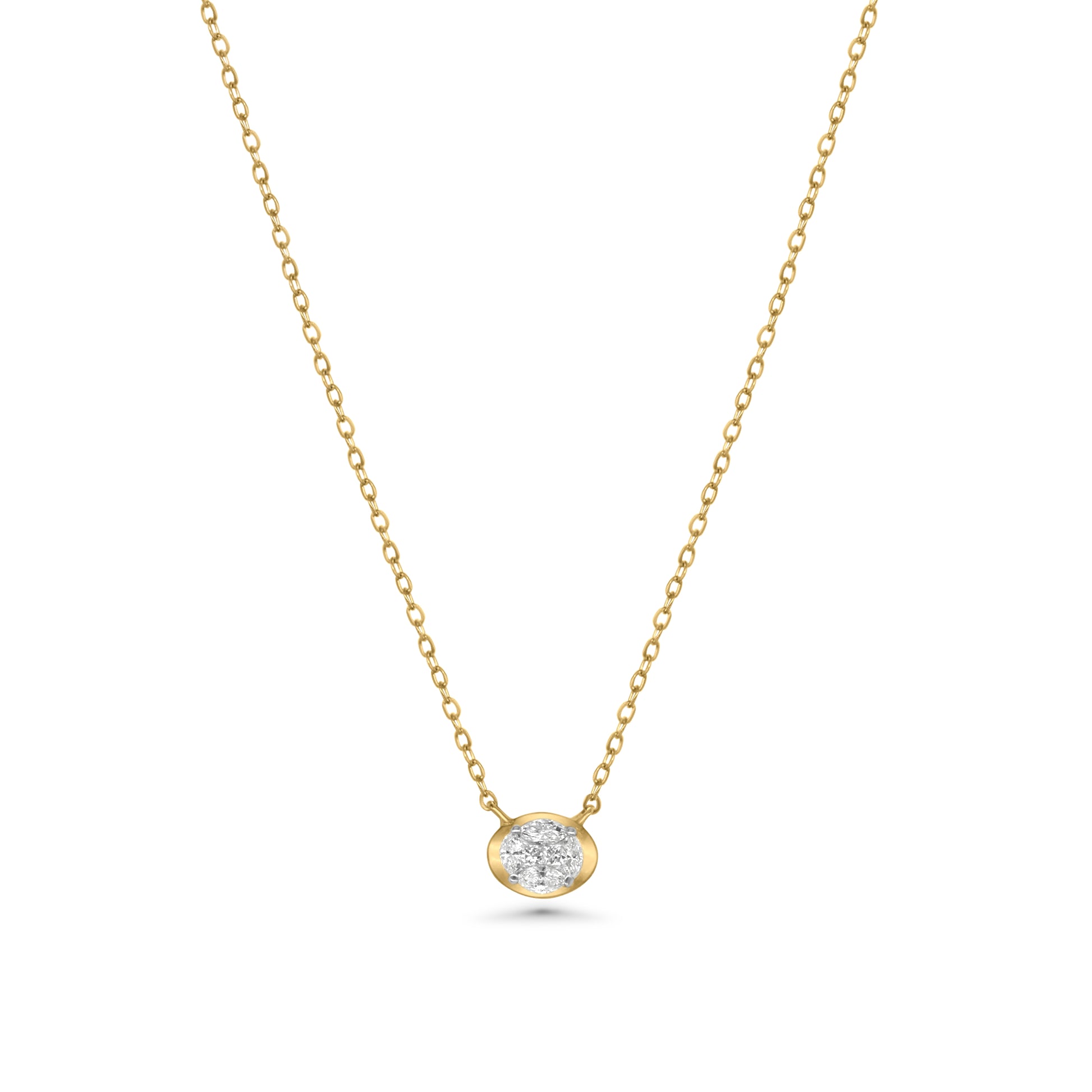 A modern take on timeless elegance — the Oval Bezel Necklace showcases a captivating oval silhouette crafted in 18K gold, framing a luminous cluster of diamonds. At its center, a 0.19ct marquise diamonds and a 0.04ct princess-cut diamonds unite to create a refined sparkle that radiates understated luxury. Its smooth bezel setting offers a sleek, contemporary touch, making it perfect for everyday wear or layering with other delicate pieces.